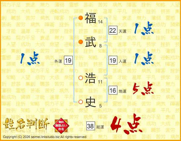あなたの人生を表す1番重要な運勢です。生涯を通じて影響する総合運となり、主に50歳以降の晩年期に影響を及ぼします。苗字と名前の合計画数。