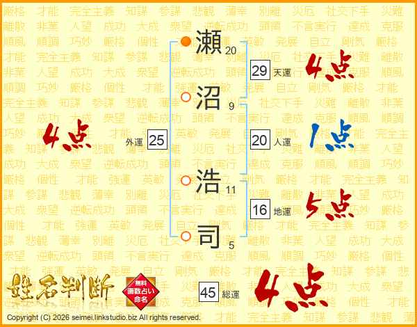 瀬沼浩司さんの総運は45画の4点!