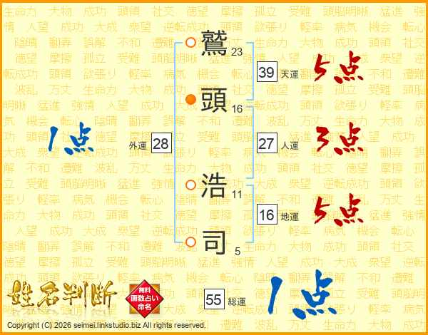 鷲(23画)頭(16画) 浩(11画)司(5画)