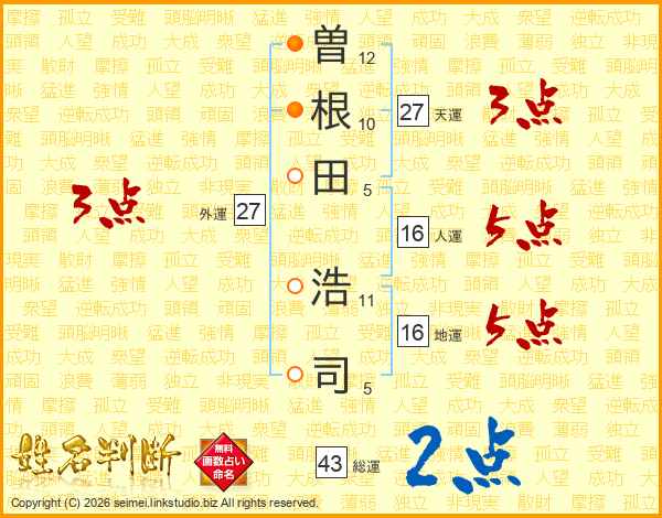 曽(12画)根(10画)田(5画) 浩(11画)司(5画)