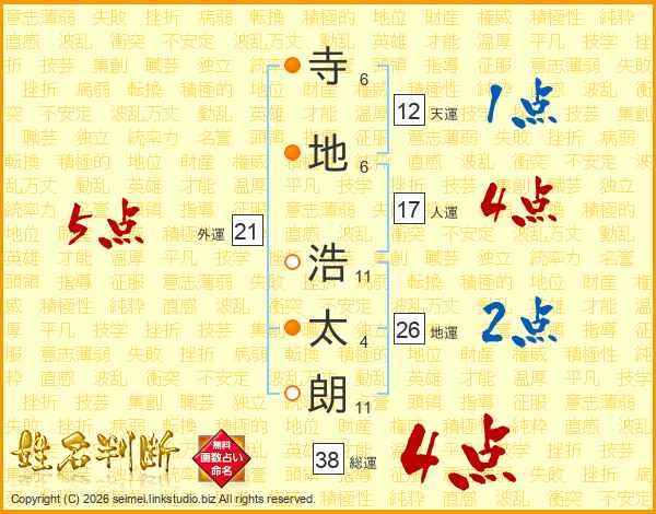 寺(6画)地(6画) 浩(11画)太(4画)朗(11画)