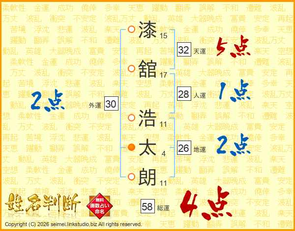 漆(15画)舘(17画) 浩(11画)太(4画)朗(11画)