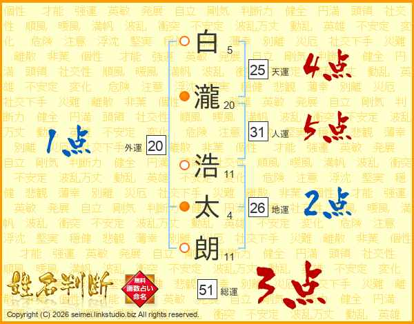 白(5画)瀧(20画) 浩(11画)太(4画)朗(11画)