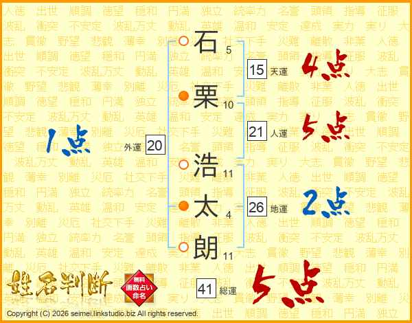 石(5画)栗(10画) 浩(11画)太(4画)朗(11画)