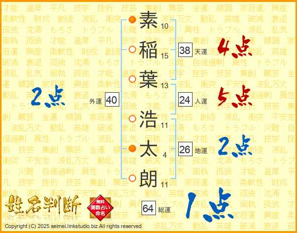 素(10画)稲(15画)葉(13画) 浩(11画)太(4画)朗(11画)