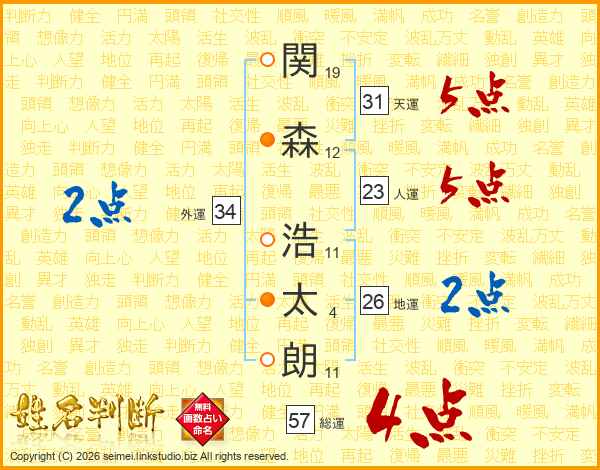 関(19画)森(12画) 浩(11画)太(4画)朗(11画)