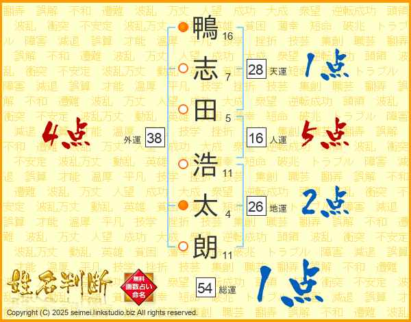 鴨(16画)志(7画)田(5画) 浩(11画)太(4画)朗(11画)