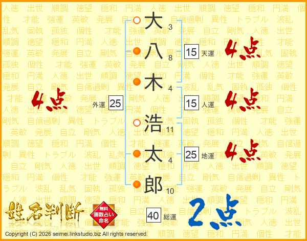 大(3画)八(8画)木(4画) 浩(11画)太(4画)郎(10画)