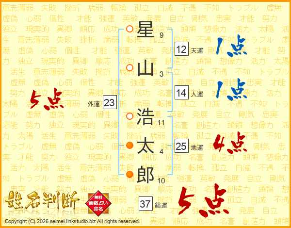 星(9画)山(3画) 浩(11画)太(4画)郎(10画)