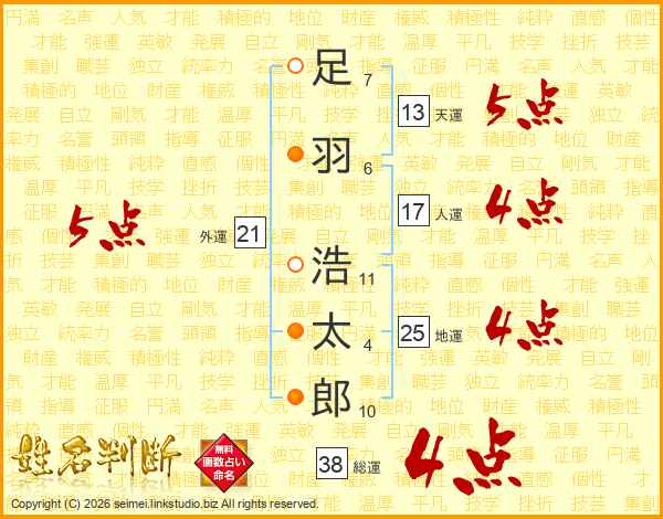 足(7画)羽(6画) 浩(11画)太(4画)郎(10画)