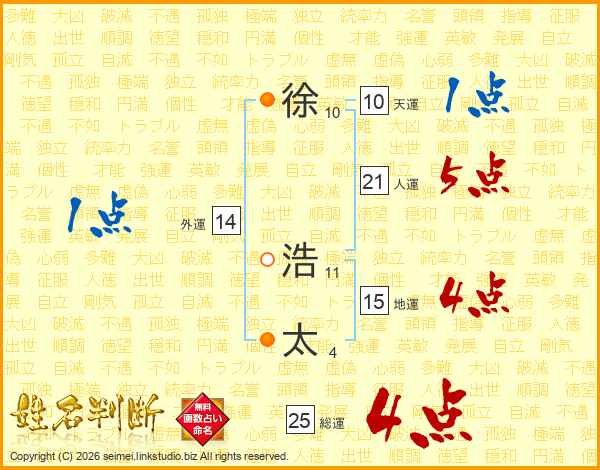 生活面を象徴する運勢です。外部から受ける影響力を表し、結婚運、家庭運や職場、環境への順応性を表します。総運から人運を引いた画数。姓や名が1文字の場合を除く。