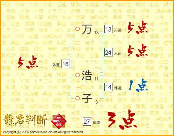 あなたの人生を表す1番重要な運勢です。生涯を通じて影響する総合運となり、主に50歳以降の晩年期に影響を及ぼします。苗字と名前の合計画数。