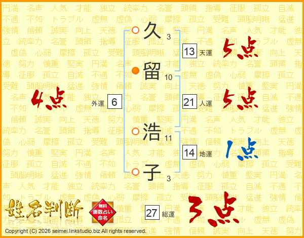 久(3画)留(10画) 浩(11画)子(3画)