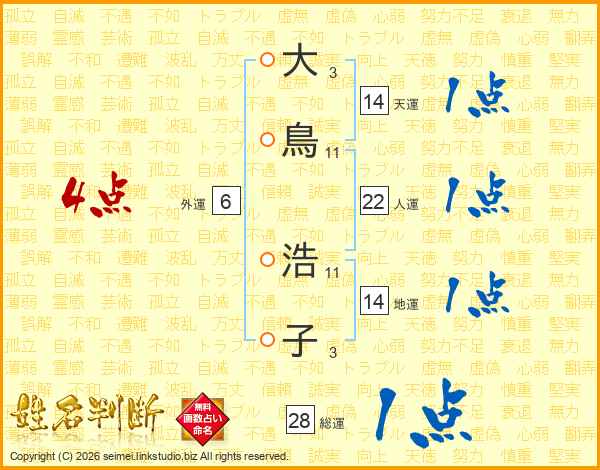 大(3画)鳥(11画) 浩(11画)子(3画)