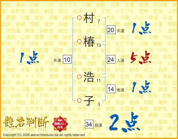 村(7画)椿(13画) 浩(11画)子(3画)