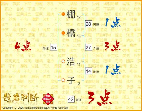 棚(12画)橋(16画) 浩(11画)子(3画)