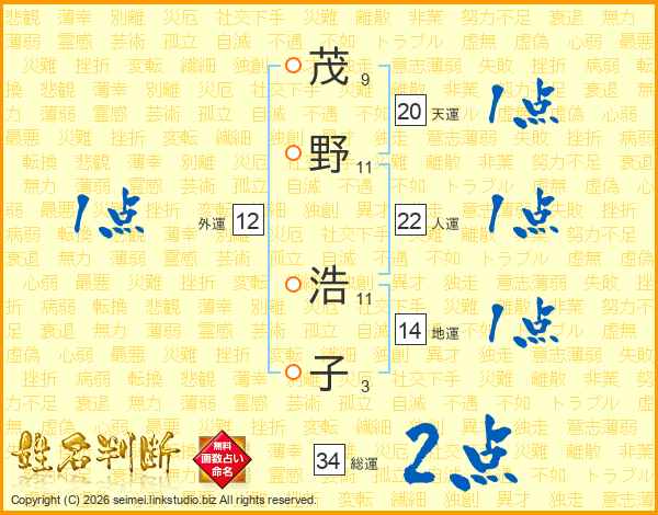 あなたの人生を表す1番重要な運勢です。生涯を通じて影響する総合運となり、主に50歳以降の晩年期に影響を及ぼします。苗字と名前の合計画数。