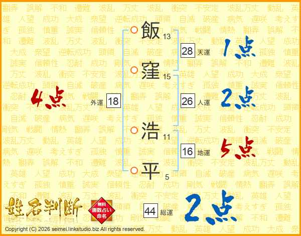 飯(13画)窪(15画) 浩(11画)平(5画)