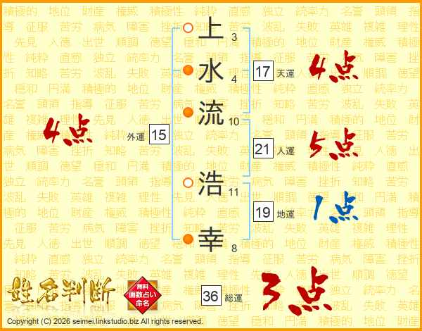 上(3画)水(4画)流(10画) 浩(11画)幸(8画)