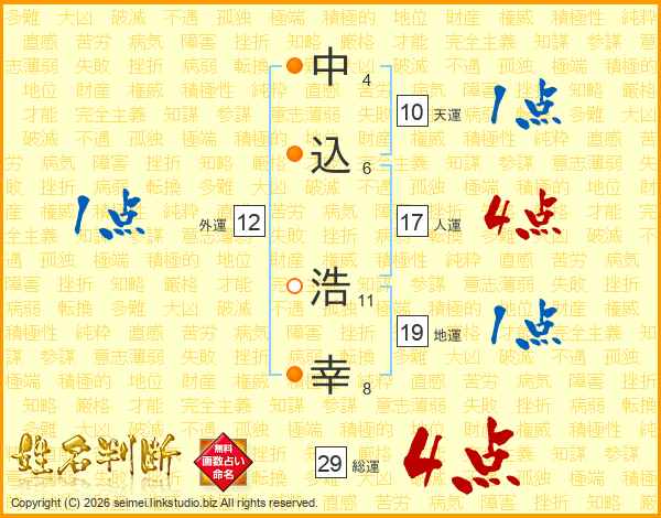 中(4画)込(6画) 浩(11画)幸(8画)