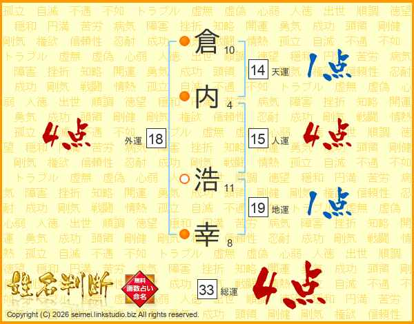 倉(10画)内(4画) 浩(11画)幸(8画)