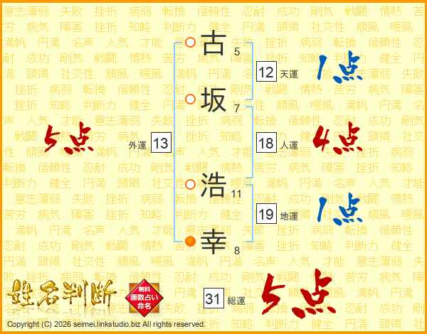 古(5画)坂(7画) 浩(11画)幸(8画)