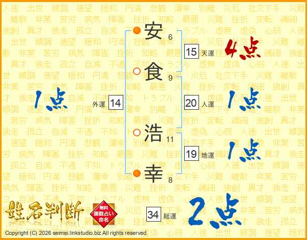 安(6画)食(9画) 浩(11画)幸(8画)