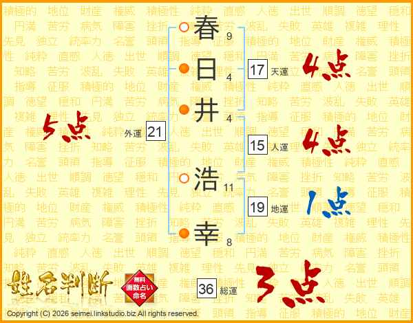 春(9画)日(4画)井(4画) 浩(11画)幸(8画)