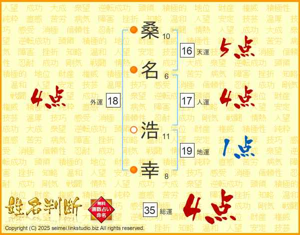 桑(10画)名(6画) 浩(11画)幸(8画)