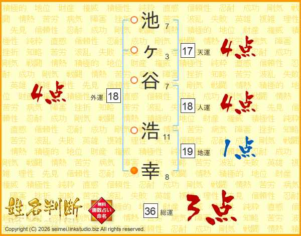 池(7画)ヶ(3画)谷(7画) 浩(11画)幸(8画)