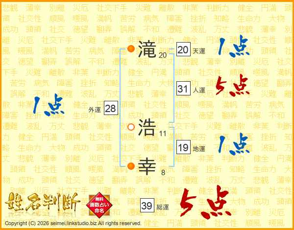 滝(20画) 浩(11画)幸(8画)