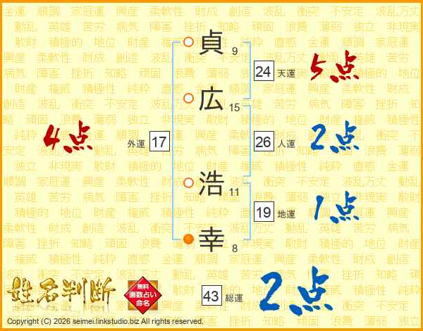 貞(9画)広(15画) 浩(11画)幸(8画)