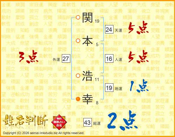 関(19画)本(5画) 浩(11画)幸(8画)