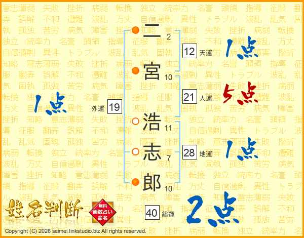 二宮浩志郎さんの人運は21画の5点!
