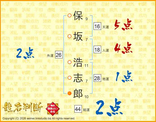 保(9画)坂(7画) 浩(11画)志(7画)郎(10画)