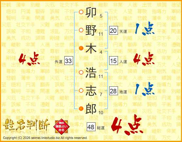 卯(5画)野(11画)木(4画) 浩(11画)志(7画)郎(10画)