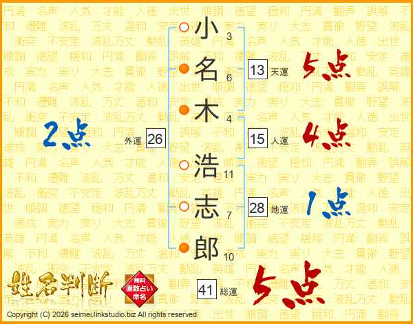 小(3画)名(6画)木(4画) 浩(11画)志(7画)郎(10画)