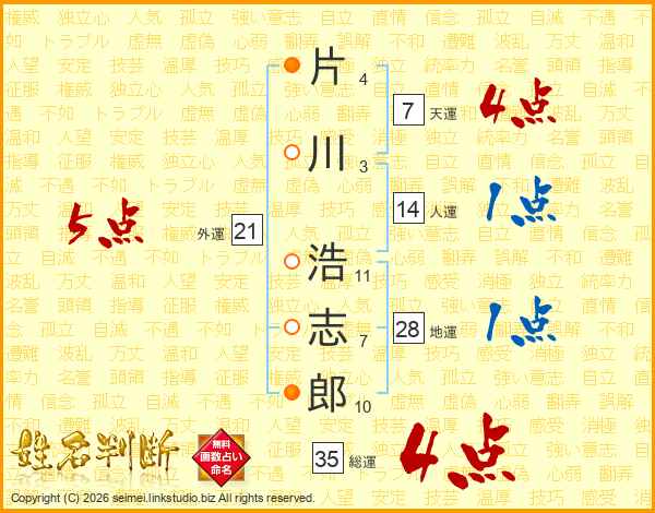 片(4画)川(3画) 浩(11画)志(7画)郎(10画)