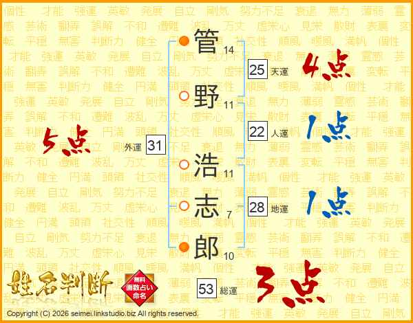 管(14画)野(11画) 浩(11画)志(7画)郎(10画)