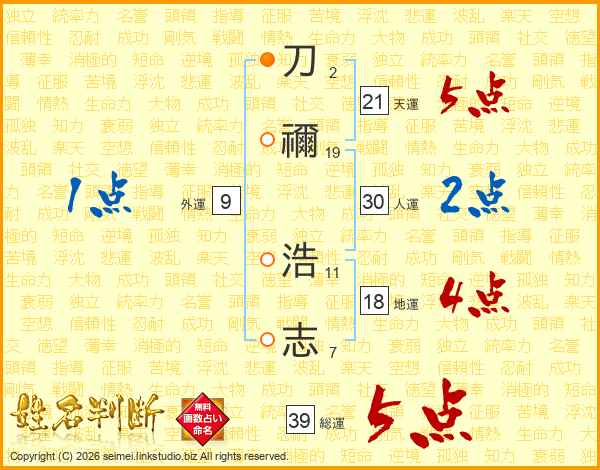 刀禰浩志さんの総運は39画の5点!