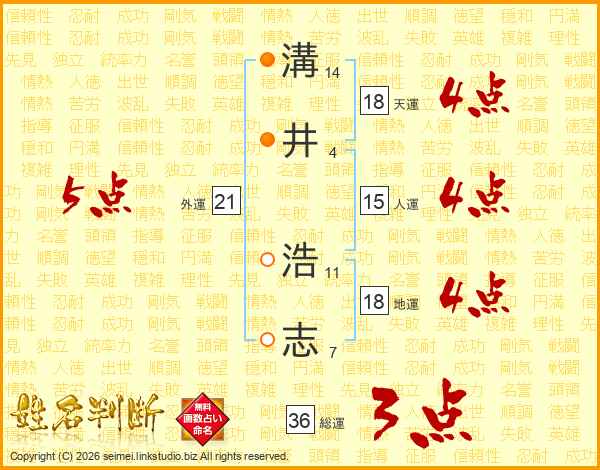 あなたの人生を表す1番重要な運勢です。生涯を通じて影響する総合運となり、主に50歳以降の晩年期に影響を及ぼします。苗字と名前の合計画数。