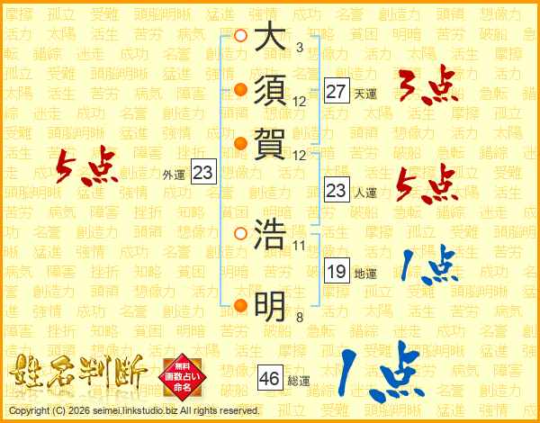 大(3画)須(12画)賀(12画) 浩(11画)明(8画)