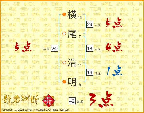 あなたの人生を表す1番重要な運勢です。生涯を通じて影響する総合運となり、主に50歳以降の晩年期に影響を及ぼします。苗字と名前の合計画数。