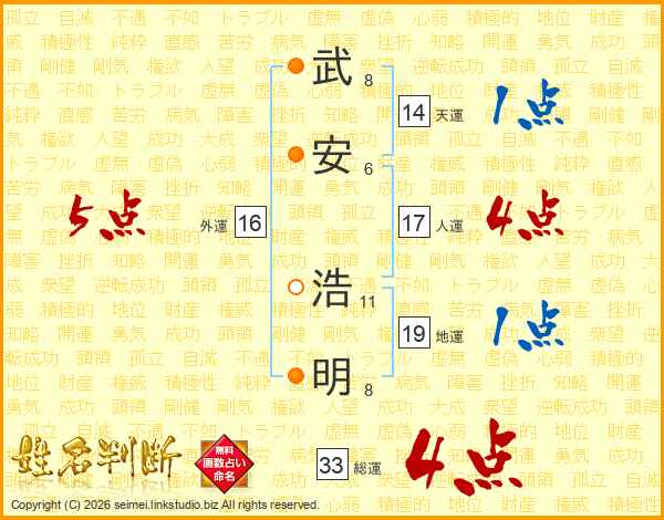 あなたの人生を表す1番重要な運勢です。生涯を通じて影響する総合運となり、主に50歳以降の晩年期に影響を及ぼします。苗字と名前の合計画数。