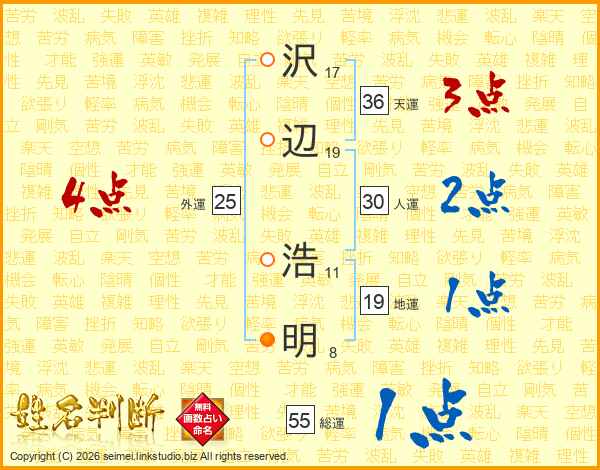 沢(17画)辺(19画) 浩(11画)明(8画)