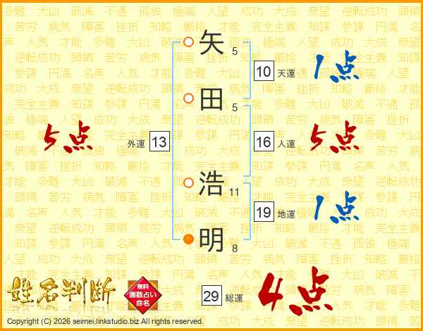 矢田浩明さんの総運は29画の4点!