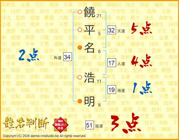 饒(21画)平(5画)名(6画) 浩(11画)明(8画)