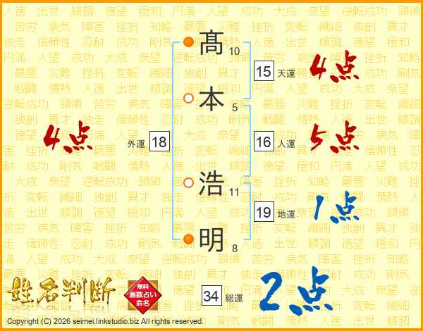 あなたの人生を表す1番重要な運勢です。生涯を通じて影響する総合運となり、主に50歳以降の晩年期に影響を及ぼします。苗字と名前の合計画数。