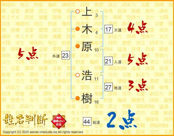 上(3画)木(4画)原(10画) 浩(11画)樹(16画)