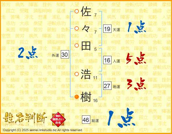 佐(7画)々(7画)田(5画) 浩(11画)樹(16画)